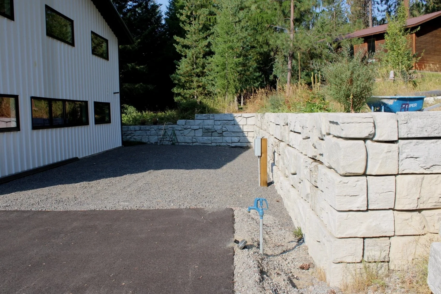Our team gave this client more usable space on the side of their shop by digging out the hillside, grading the site, and building a decorative concrete block retaining wall that is functional and beautiful.